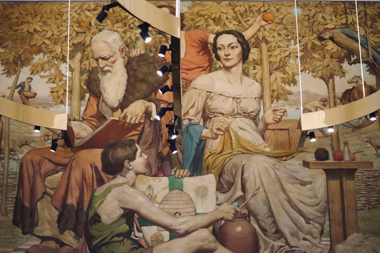 Waller was a remarkable local painter, mosaicist, and stained-glass artist whose large format work adorns several buildings in Melbourne. Every day, thousands of people ascend the marble stairs of the State Library without glancing up to notice Waller’s 1929 mural, Peace After Victory. Or walk down Collins Street past the Versace store without turning their head to admire his not-so-snappily-titled, Better Than to Squander Life’s Gifts is to Conserve Them and Ensure a Fearless Future. What a shame.